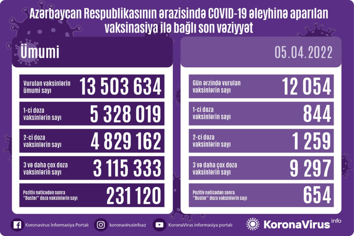 Azərbaycanda son sutkada koronavirus (COVID-19) əleyhinə 12 054 vaksin vurulub. Bir gündə birinci mərhələ üzrə vaksinasiya olunanların sayı 844, ikinci mərhələ üzrə vaksinasiya olunanların sayı 1 259, üç və daha çox doza vaksin vurduranların sayı 9 297, pozitiv nəticədən sonra buster doza üzrə vaksinasiya olunanların sayı isə 654 nəfərdir.