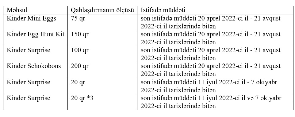Bildirilib ki, İtaliyanın “Ferrero” şirkətinin Belçikada yerləşən müəssisəsində istehsal olunan son istifadə müddəti 20 aprel – 21 avqust, 11 iyul - 7 oktyabr 2022-ci il tarixli bəzi məhsullarında salmonella olması ehtimalı ilə bağlı həmin məhsul partiyaları geri çağırılıb.