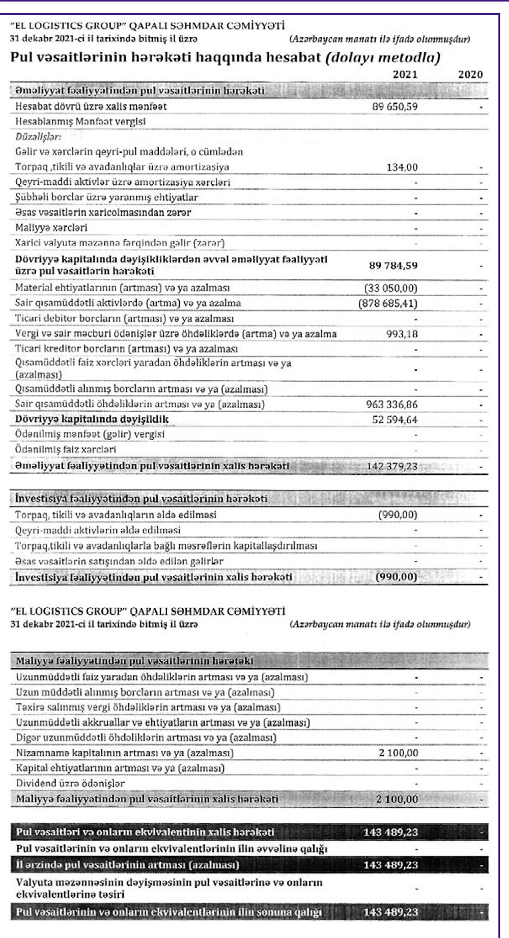 “Azərbaycan Dəmir Yolları” QSC-nin rəsmi yük agenti “EL Logistics Group” Qapalı Səhmdar Cəmiyyəti 2021-ci ili 89 min 650 manat xalis mənfəət ilə başa vurub.