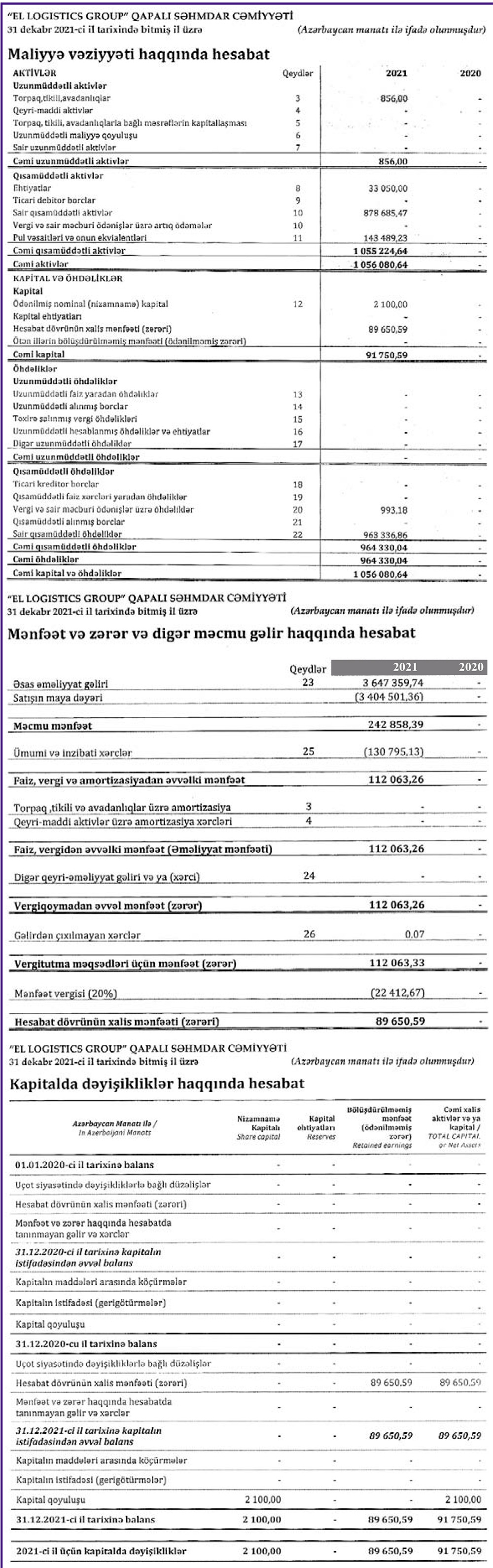 Marja.az şirkətin maliyyə hesabatlarına istinadən xəbər verir ki, ötən il “EL Logistics Group”un cəmi gəlirləri 3 milyon 647 min manat, cəmi xərcləri 3 milyon 558 min manat təşkil edib.