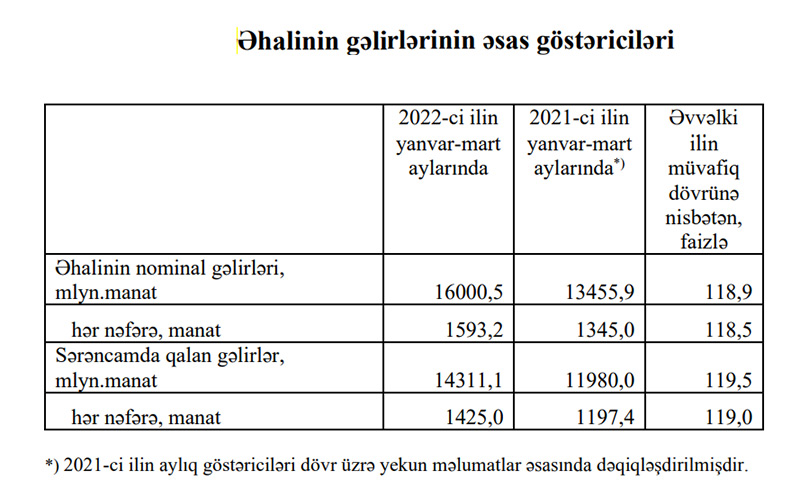 İlkin məlumatlara görə, 2022-ci ilin yanvar-mart aylarında ölkə əhalisinin nominal gəlirləri 16 milyard 5 milyon manat və ya hər nəfərə orta hesabla 1593,2 manat təşkil etmişdir. Bütün icbari və könüllü ödənişlər edildikdən sonra əhalinin sərəncamında 14 milyard 311,1 milyon manatlıq vəsait qalmışdır.