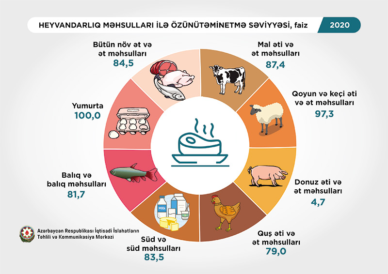 İqtisadi İslahatların Təhlili və Kommunikasiya Mərkəzi Azərbaycanın bitkiçilik, heyvandarlıq və sənaye emalından keçmiş əsas növ ərzaq məhsulları ilə özünütəminetmə səviyyəsini araşdırıb.