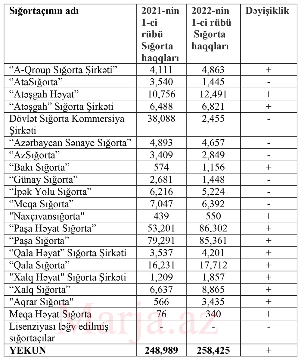 2022-ci ilin 1-ci rübündə Azərbaycanda fəaliyyət göstərən 20 sığorta şirkətindən 7-sinin hesabladığı sığorta haqları (yığımlar) azalıb.