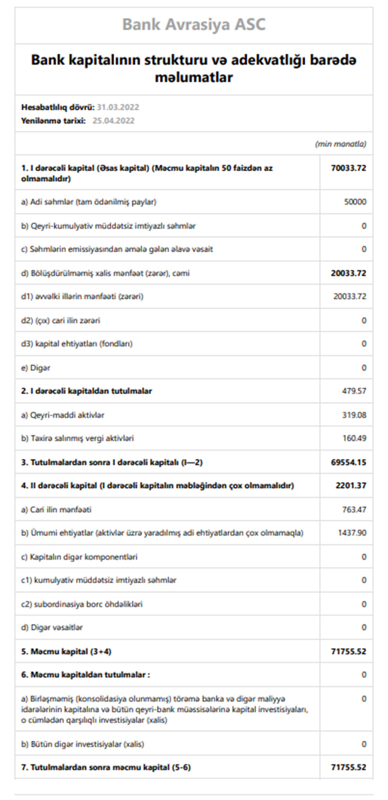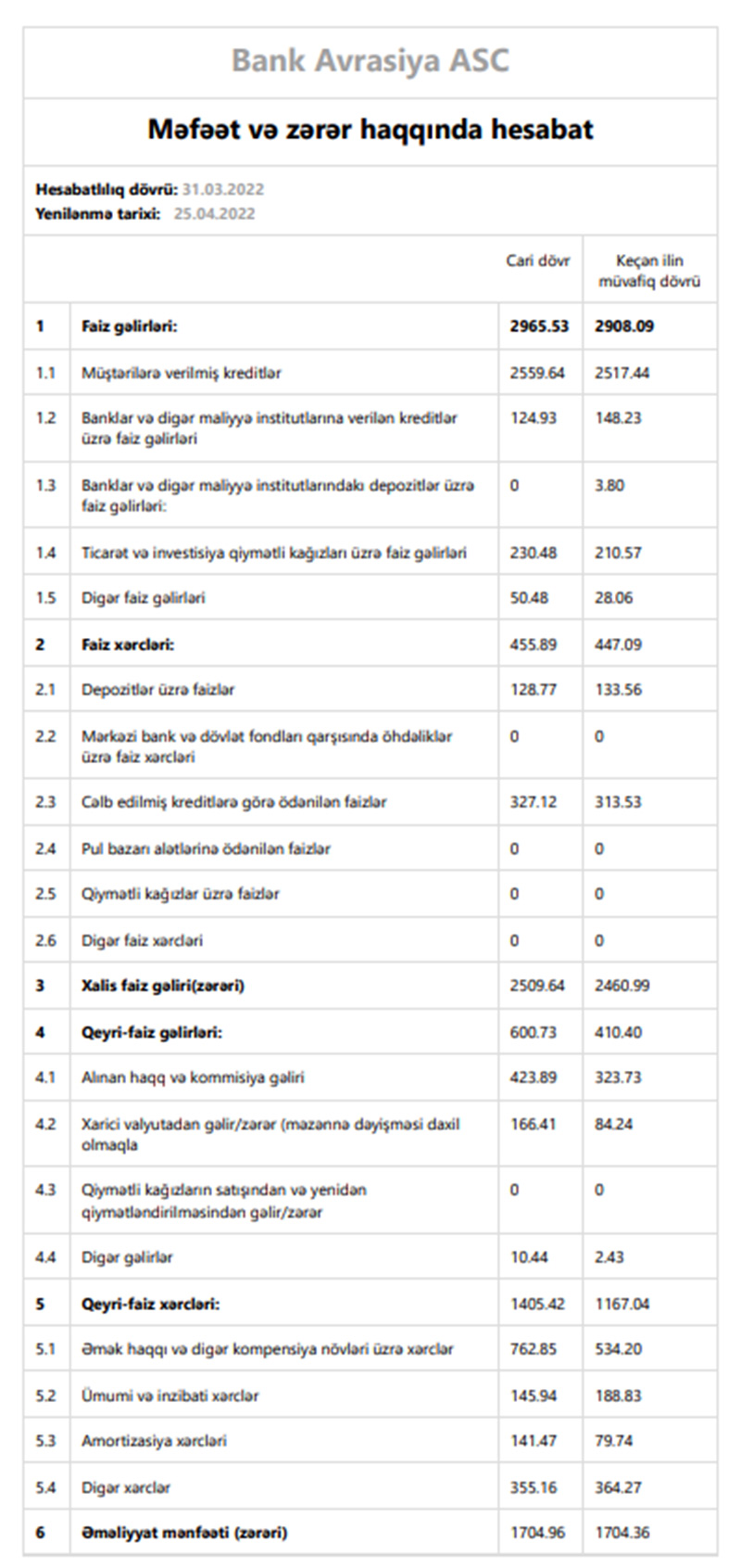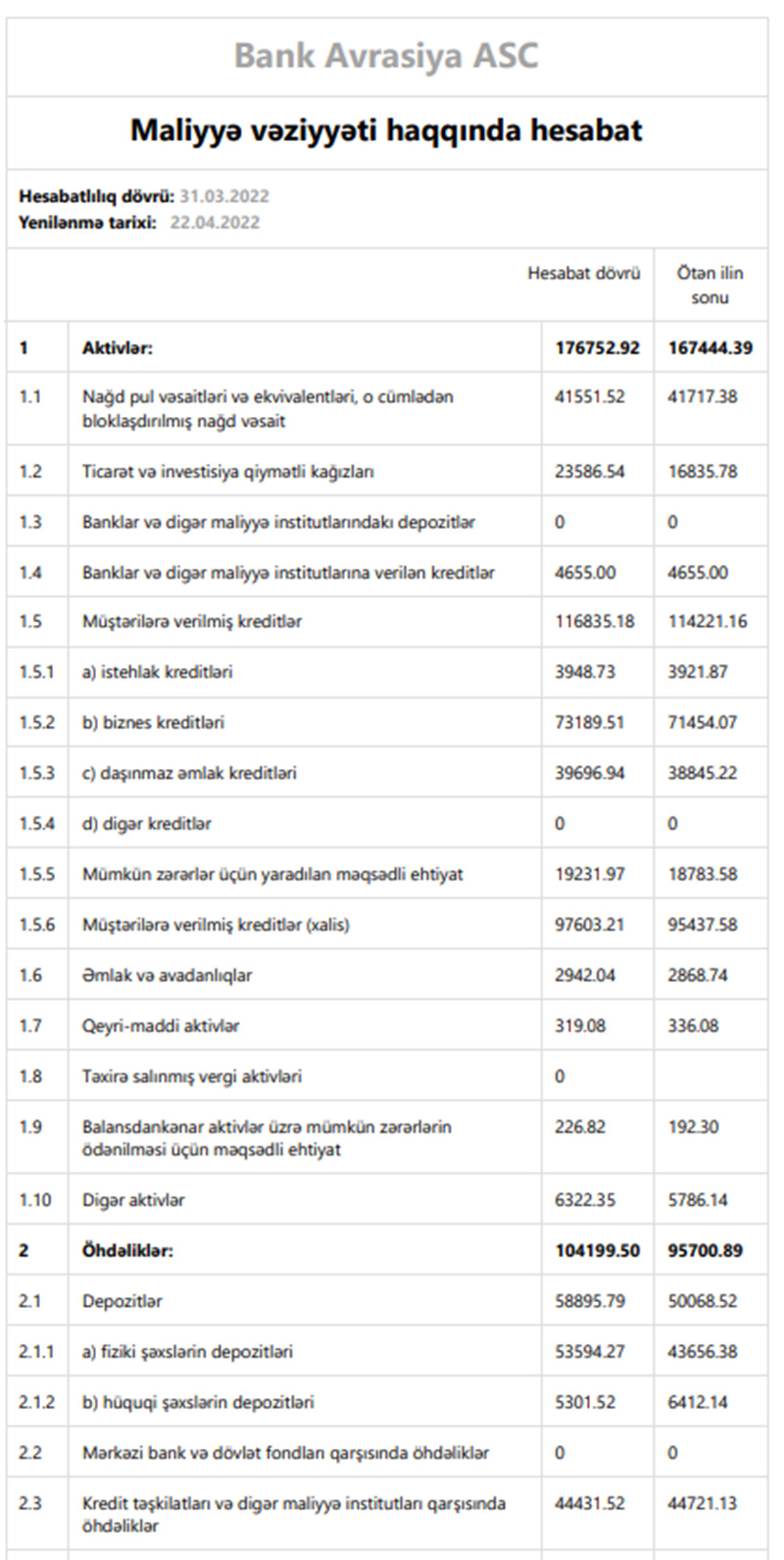 "Bank Avrasiya" ASC 2022-ci ilin ilk rübünü 763 min manat xalis mənfəət ilə başa vurub. Bank 2021-ci ilin ilk rübünü 351 min manat xalis mənfəət ilə bağlamışdı. Beləliklə, "Bank Avrasiya"nın xalis mənfəəti 2 dəfədən çox artıb. Xalis mənfəətin artması gəlirlərin artması, eyni zamanda, mümkün zərərlər üçün yaradılan ehtiyatlara ayırmanın azalması ilə əlaqədardır.