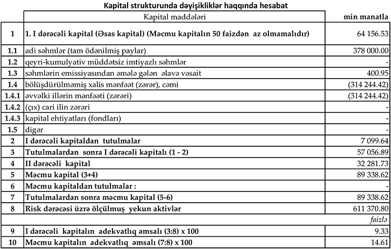 Bank-ın məcmu kapitalı 89 milyon manat təşkil edib ki, bu da requlyativ tələbdən 39 milyon manat çoxdur. Məcmu kapitalın adekvatlıq əmsalı 14.61%, birinci dərəcəli kapitalın adekvatlıq əmsalı isə 9.33% olmaqla, hər iki göstərici üzrə tələb olunan normanı üstələyir.