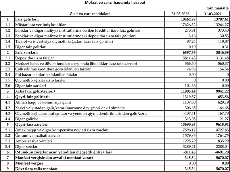 Qeyd edilib ki,Bank kredit portfeli üzrə də uzun müddətdir ki, artım tendensiyasını qoruyub saxlayır. Belə ki, 2021-ci ilin sonu ilə müqayisədə kredit portfeli 26 milyon manat artaraq 472 milyon manata çatıb. Hesabat dövrü ərzində Bank real sektorun maliyyələşməsinə 77 milyon manat kredit ayrılıb.