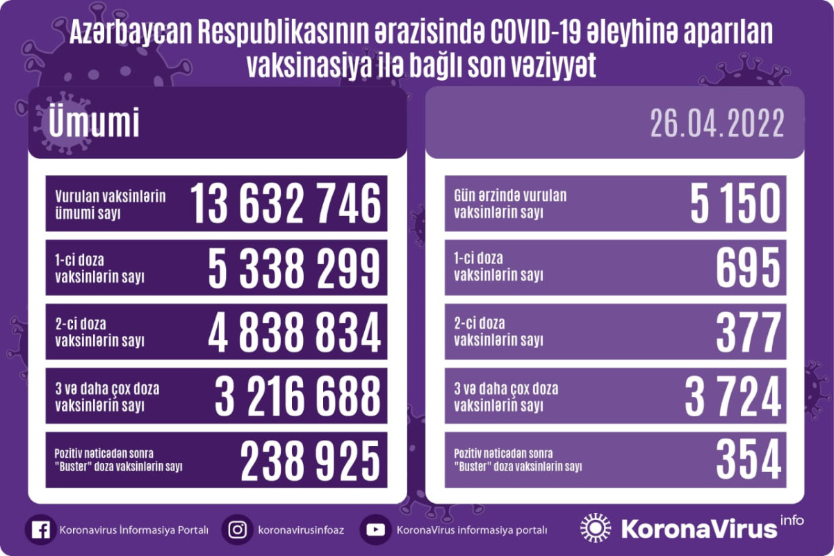 Nazirlər Kabineti yanında Operativ Qərargahdan APA-ya verilən məlumata görə, bir gündə birinci mərhələ üzrə vaksinasiya olunanların sayı 695, ikinci mərhələ üzrə vaksinasiya olunanların sayı 377, üç və daha çox doza üzrə vaksinasiya olunanların sayı 3 724, pozitiv nəticədən sonra buster doza üzrə vaksinasiya olunanların sayı 354 nəfərdir.