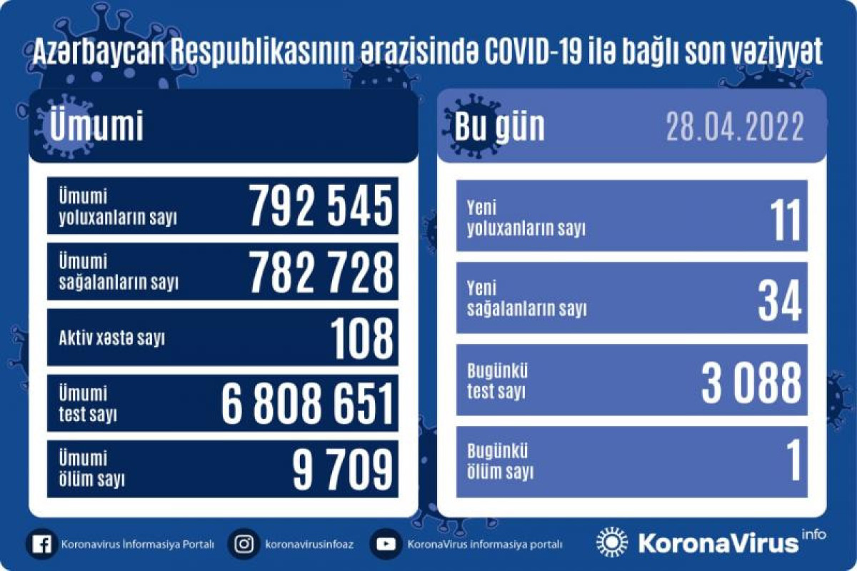 Azərbaycan Respublikasında koronavirus (COVID-19) infeksiyasına 11 yeni yoluxma faktı qeydə alınıb, 34 nəfər müalicə olunaraq sağalıb.