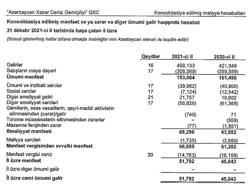 Marja.az xəbər verir ki, xalis mənfəətin artması gəlirlərin artmasına rağmən xərclərin azalmasından qaynaqlanır."Azərbaycan Xəzər Dəniz Gəmiçiliyi"nin gəlirləri 2020-ci ildə 421 milyon 49 min manat ikən, 2021-ci ildə 459 miylon 133 min manata yükəlib (38 milyon 84 min manat artıb). Eyni zamanda, satışın maya dəyəri 46 milyon 510 min manat artıb. Qısası, satışın maya dəyərinin daha çox artması gəlirlərdəki artımı tamamilə silib və ümumi mənfəətin aşağı düşməsinə səbəb olub. Lakin inzibati, sosial və digər xərclərin azaldılması hesabına şirkətin xalis mənfəəti 2020-ci illə müqayisədə 2021-ci ildə daha yüksək olub.