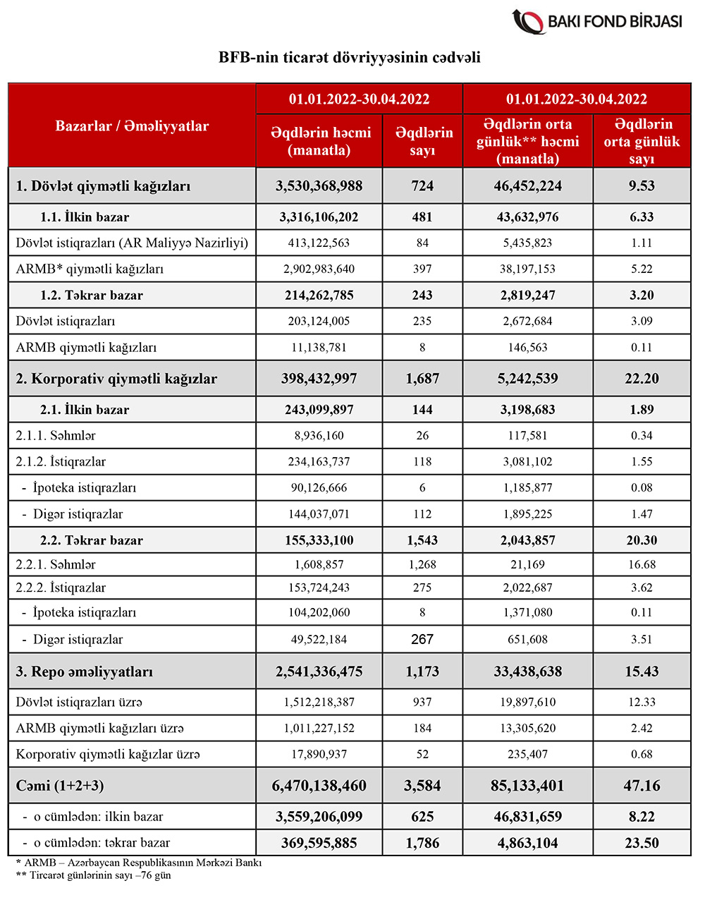 Azərbaycanın Maliyyə Nazirliyi 2022-ci ilin ilk 4 ayında (yanvar-aprel) dövlət istiqrazlarının yerləşdirilməsi yolu ilə 413 milyon 122 min 563 min manat cəlb edib.