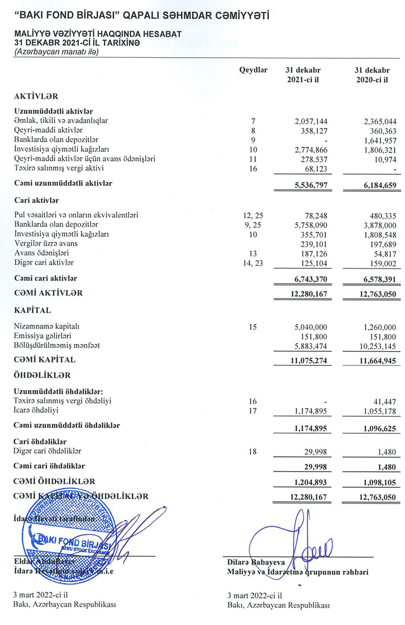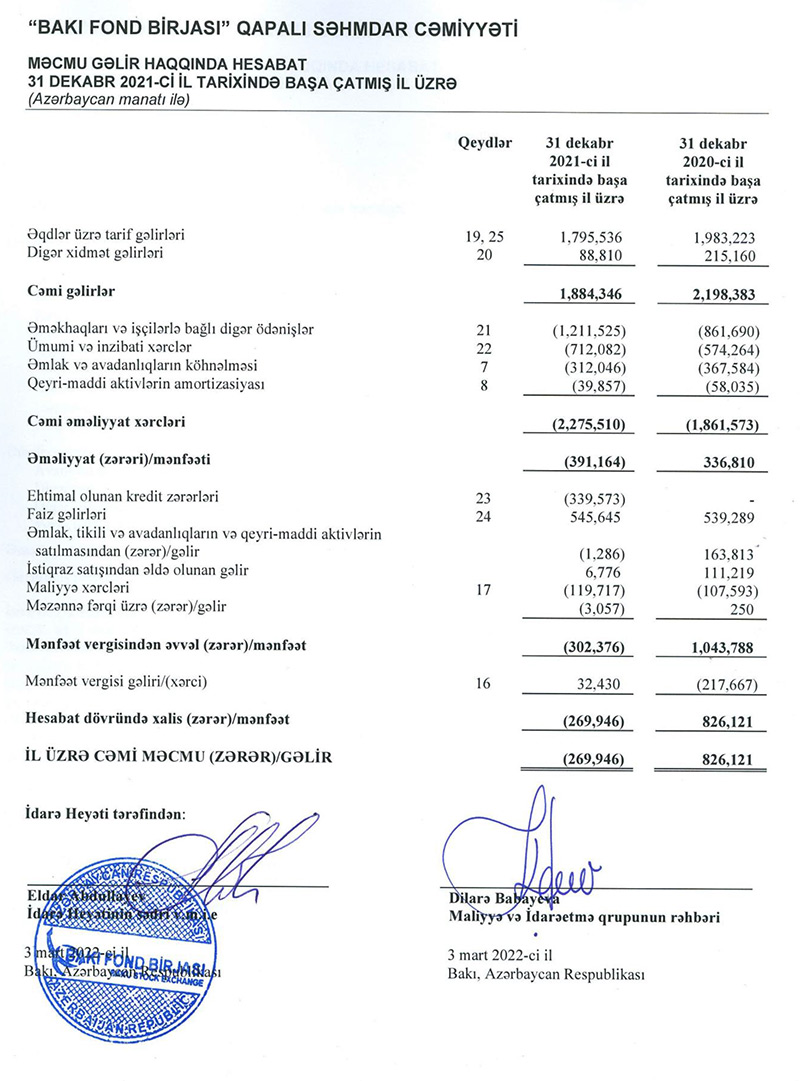 "Bakı Fond Birjası" QSC 2021-ci ili 270 min manat xalis zərər ilə başa vurub. Halbuki, Birja 2020-ci ili 826 min manat xalis mənfəət ilə bağlamışdı. Ötənilki zərərin səbəbləri gəlirlərin azalması ilə bərabər, bir sıra xərclərin artmasıdır.