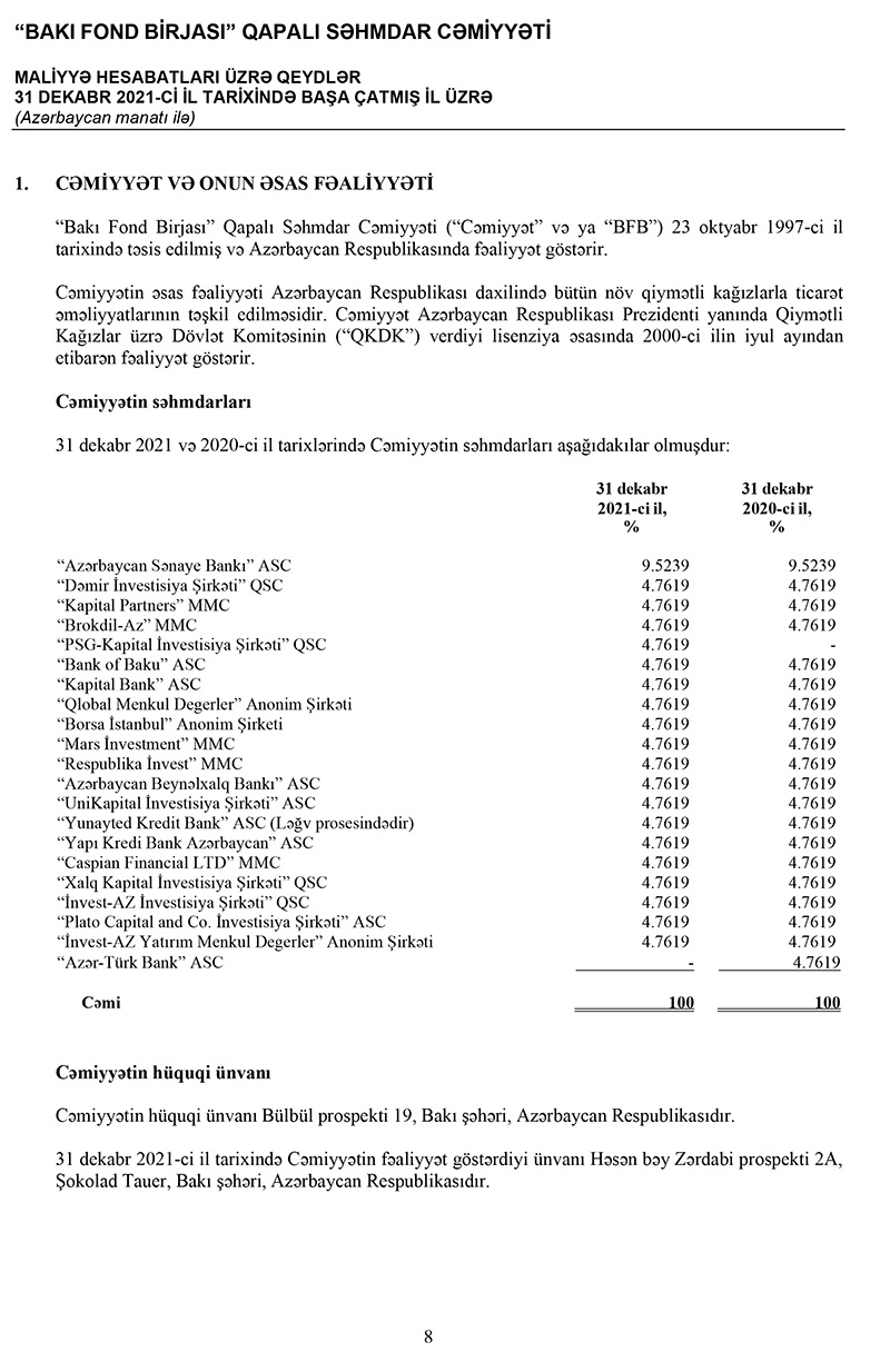31 Dekabr 2021-ci il tarixində "Bakı Fond Birjası"nın 20 səhmdarı olub.