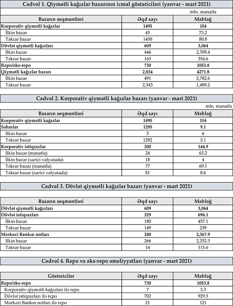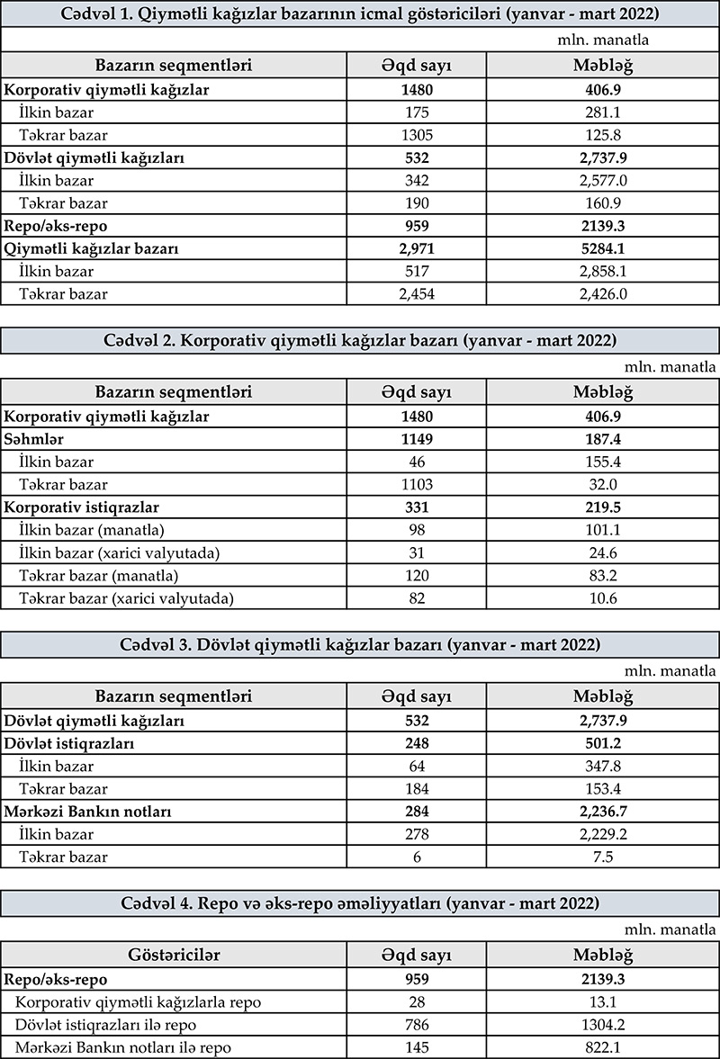 Azərbaycan Mərkəzi Bankı 2022-ci ilin yanvar - mart dövrü üzrə qiymətli kağızlar bazarının icmal göstəricilərini açıalyıb.
