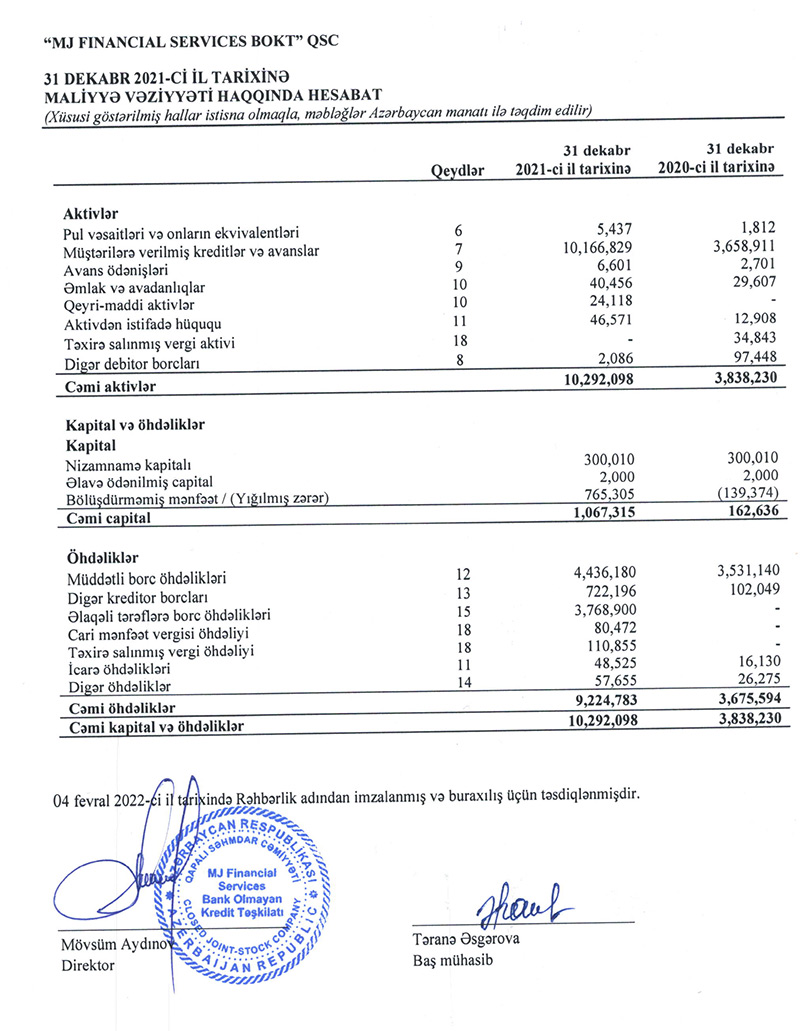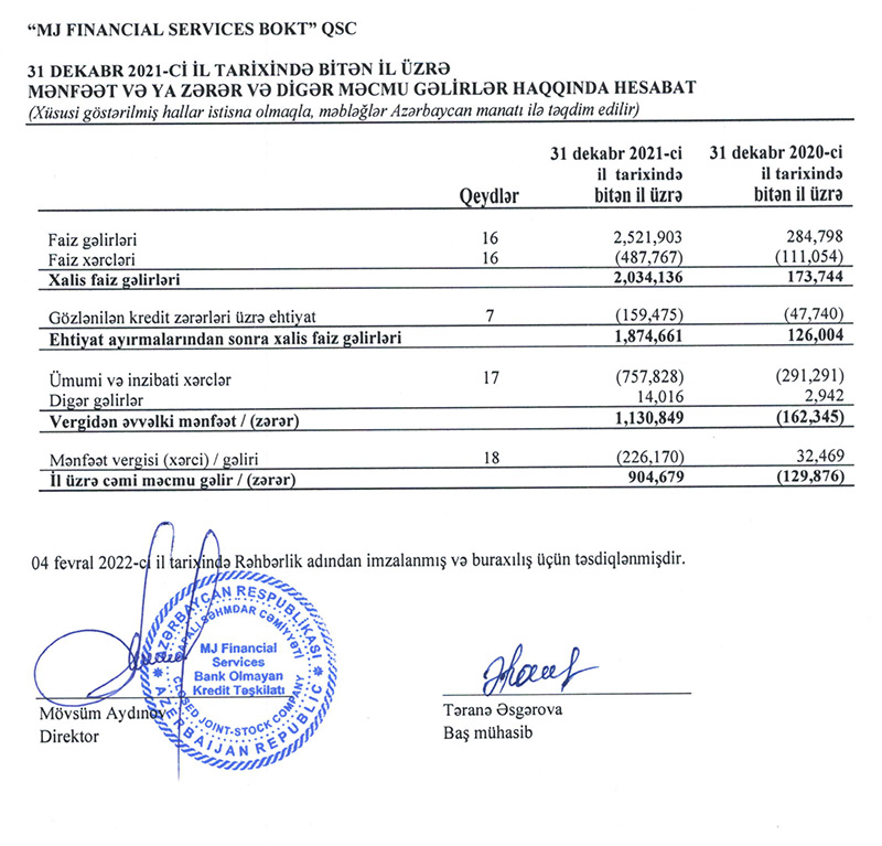 “MJ Financial Services” BOKT (MJ FS BOKT) 2021-ci ili 905 min manat xalis mənfəət ilə başa vurub. Halbuki, BOKT 2020-ci ili 130 min manat xalis zərər ilə bağlamışdı.