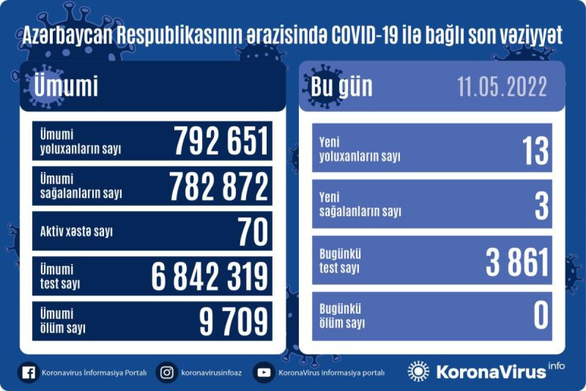 Azərbaycan Respublikasında koronavirus (COVID-19) infeksiyasına 13 yeni yoluxma faktı qeydə alınıb, 3 nəfər müalicə olunaraq sağalıb.