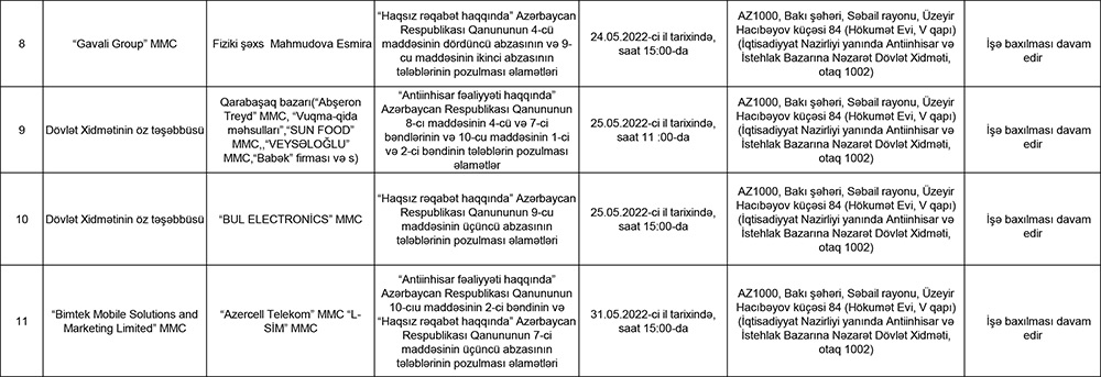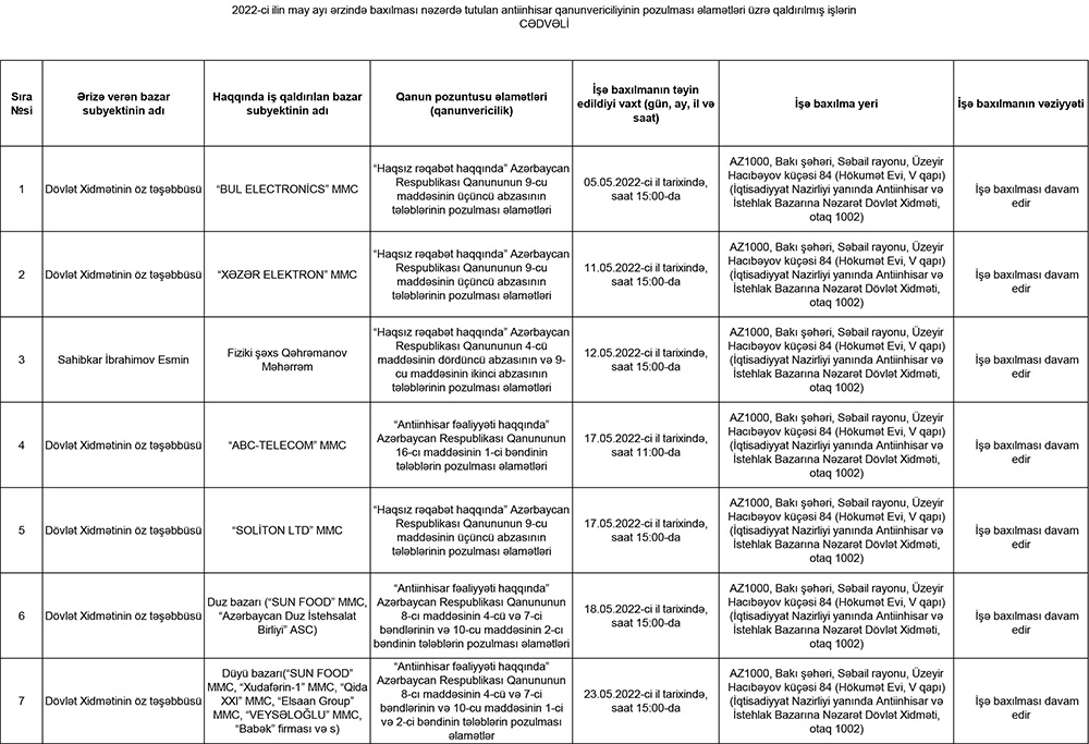 Marja.az xəbər verir ki, iş “Antiinhisar fəaliyyəti haqqında” Azərbaycan Respublikası Qanununun 10-cıu maddəsinin 2-ci bəndinin və “Haqsız rəqabət haqqında” Azərbaycan Respublikası Qanununun 7-ci maddəsinin üçüncü abzasının tələblərinin pozulması əlamətləri üzrə qaldırılıb.