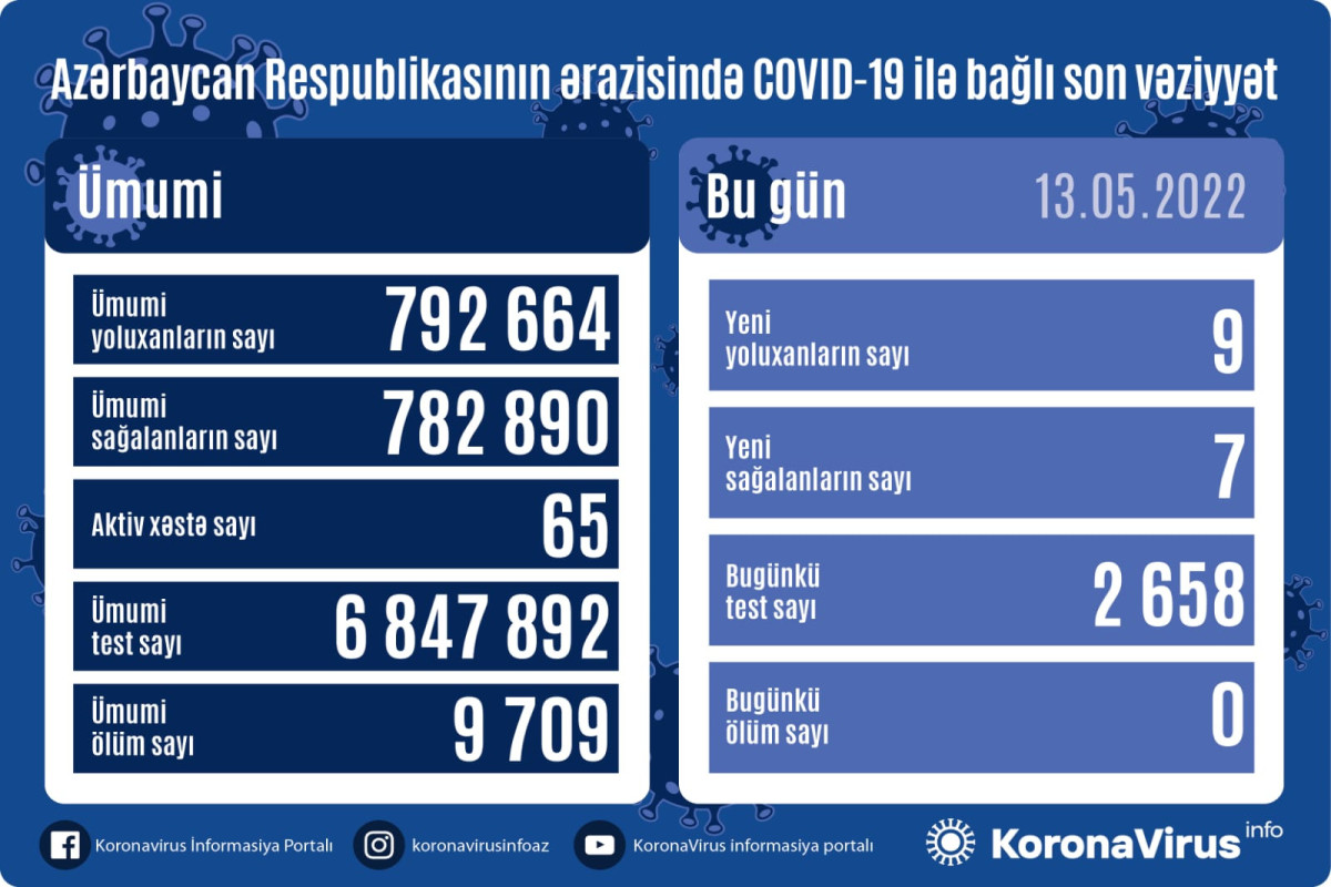Azərbaycan Respublikasında koronavirus (COVID-19) infeksiyasına 9 yeni yoluxma faktı qeydə alınıb, 7 nəfər müalicə olunaraq sağalıb.