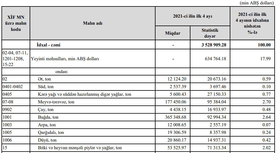 2021-ci ilin ilk 4 ayı ərzində Azərbaycana 634 milyon 764 min dollar dəyərində yeyinti məhsulları idxal edilmişdi.