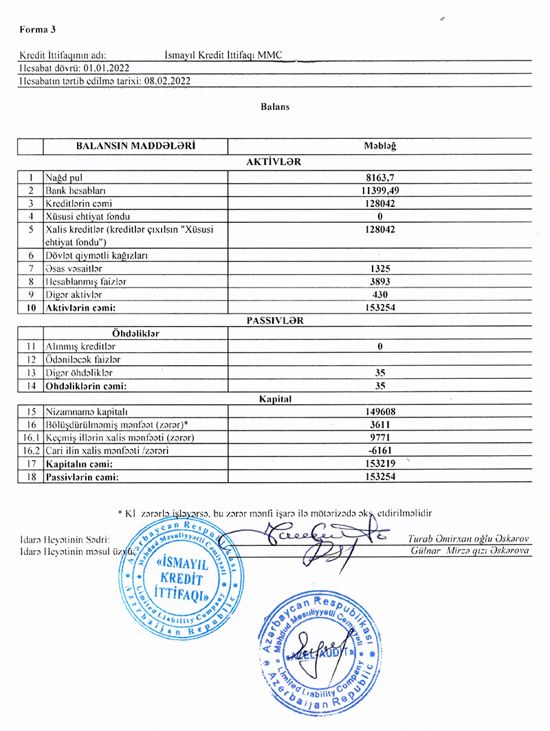"İsmayıl Kredit İttifaqı" MMC-nin 31 dekabr 2021-c il tarixində bitən il üzrə maliyyə hesabatları.