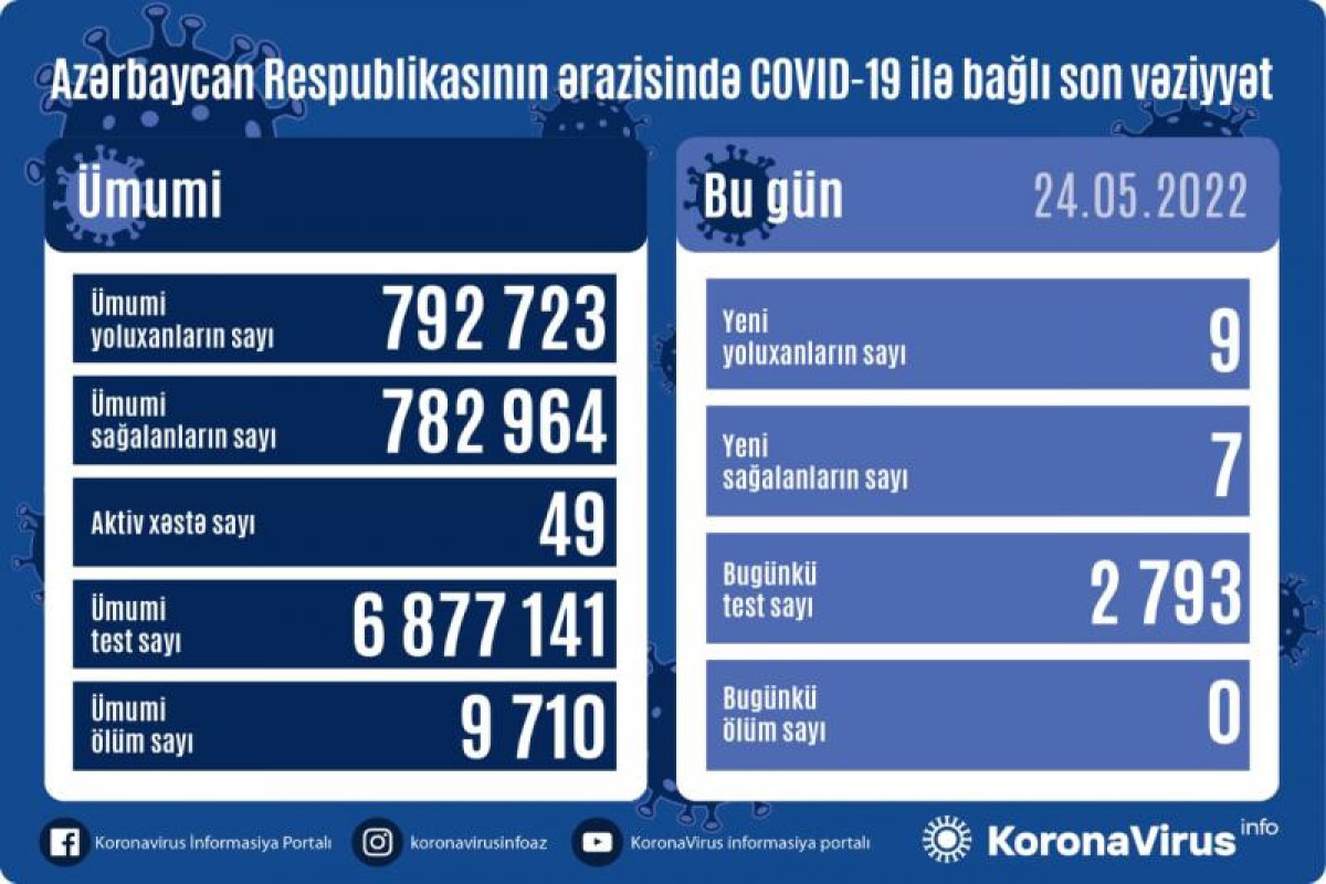 Azərbaycan Respublikasında koronavirus (COVID-19) infeksiyasına 9 yeni yoluxma faktı qeydə alınıb, 7 nəfər müalicə olunaraq sağalıb.