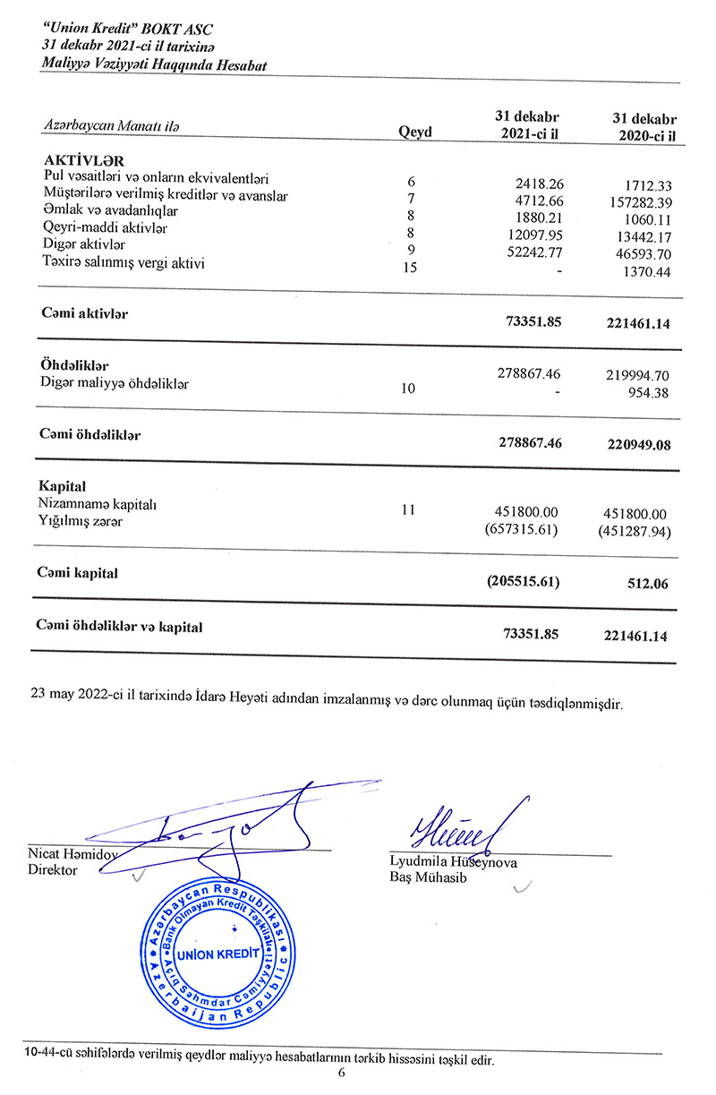 Yığılmış 657 min 315 min manat zərər ilə əlaqədar olaraq "Union Kredit" 451 min 800 manat olmuş nizamnamə kapitalını itirib. Ötən ilin sonunda təşkilatın kapitalı mənfi 205 min 516 manat olub.
