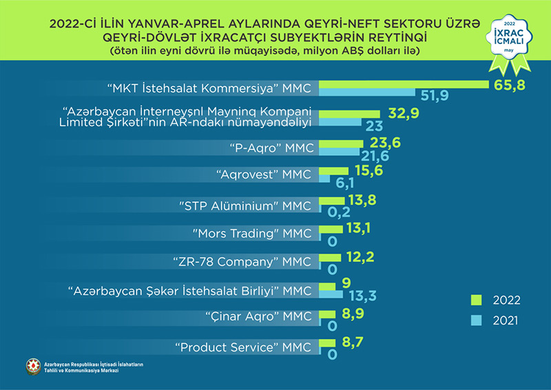 2022-ci ilin yanvar-aprel ayları üzrə hazırlanan qeyri-dövlət ixracatçı subyektlərin reytinqində ilk onluqda aşağıdakı şirkətlər təmsil olunurlar: “MKT İstehsalat Kommersiya” MMC, “Azərbaycan İnterneyşnl Mayninq Kompani Limited Şirkəti”nin Azərbaycan Respublikasındakı Nümayəndəliyi, “P-Aqro” MMC, “Aqrovest” MMC, “STP Alüminium” MMC, “Mors Trading” MMC, “ZR-78 Company” MMC, “Azərbaycan Şəkər İstehsalat Birliyi” MMC, “Çinar Aqro” MMC, “Product Service” MMC.