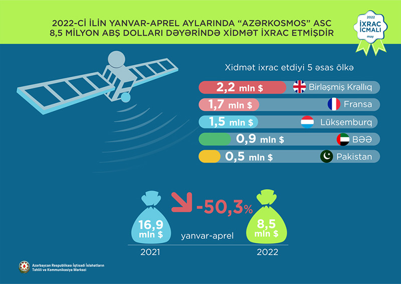 İcmalda qeyd edilib ki, 2022-ci ilin yanvar-aprel aylarında “Azərkosmos” ASC tərəfindən dünyanın 32 ölkəsinə 8,5 milyon ABŞ dolları dəyərində xidmət (peyk telekommunikasiya xidmətləri və optik peyk xidmətləri) ixrac edilib.