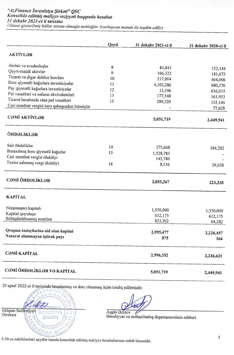 2020-ci illə müqayisədə 2021-ci ildə "AzFinans"ı qiymətli kağızlara investisiyaları 6 dəfə artaraq 4 milyon 103 min manata çatıb.