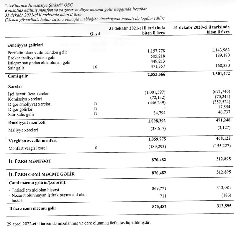 "AzFinans İnvestisiya Şirkəti" QSC 2021-ci ili 870 min manat xalis mənfəət ilə başa vurub. Şirkət 2020-ci ili 313 min manat xlias mənfəət ilə bağlamışdı. Beləliklə, 2020-ci illə müqayisədə 2021-ci ildə "AzFinans"ın xalis mənfəəti 2,8 dəıfə artıb.
