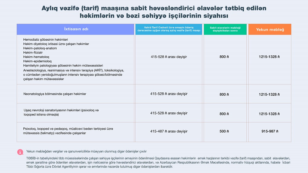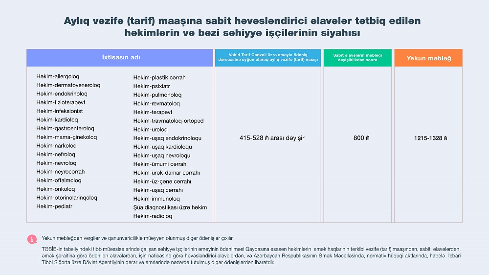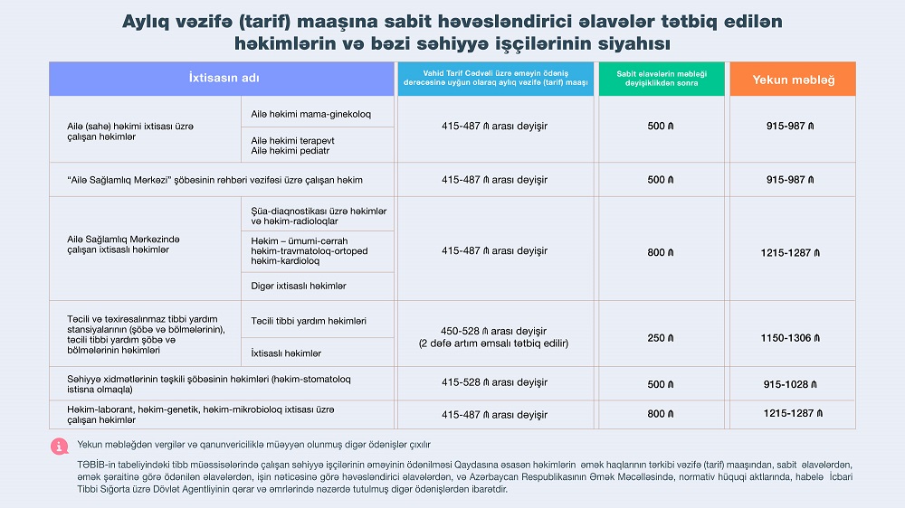 Dəyişiklikliyə əsasən səhiyyə xidmətlərinin təşkili şöbəsinin həkimlərinə (həkim-stomatoloq istisna olmaqla) və ailə həkimi ixtisasları üzrə çalışan həkimlərə verilən aylıq həvəsləndirici əlavələrin məbləği də artıb. Belə ki, onların aylıq vəzifə (tarif) maaşına tətbiq edilən aylıq sabit həvəsləndirici əlavənin məbləği 500 manata çatdırılıb.