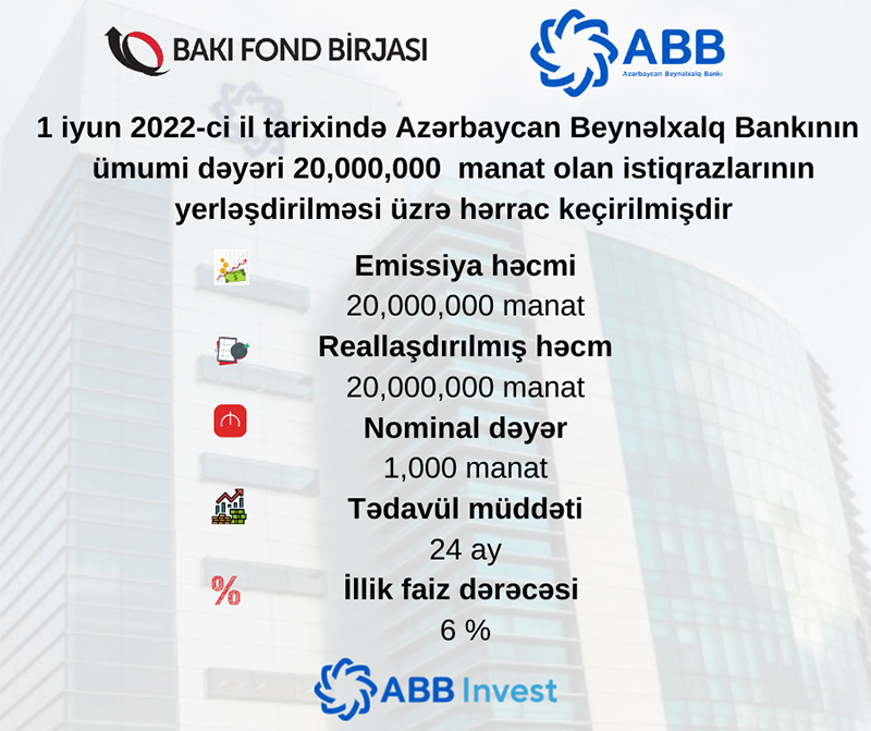 1 iyun 2022-ci il tarixində Bakı Fond Birjasında “Azərbaycan Beynəlxalq Bankı” ASC-nin tədavül müddəti 24 ay olan AZ2001004582 dövlət qeydiyyat nömrəli, 20 milyon manat həcmində, faizli, təmin edilməmiş sənədsiz, adlı istiqrazlarının yerləşdirilməsi üzrə hərrac yekunlaşıb.