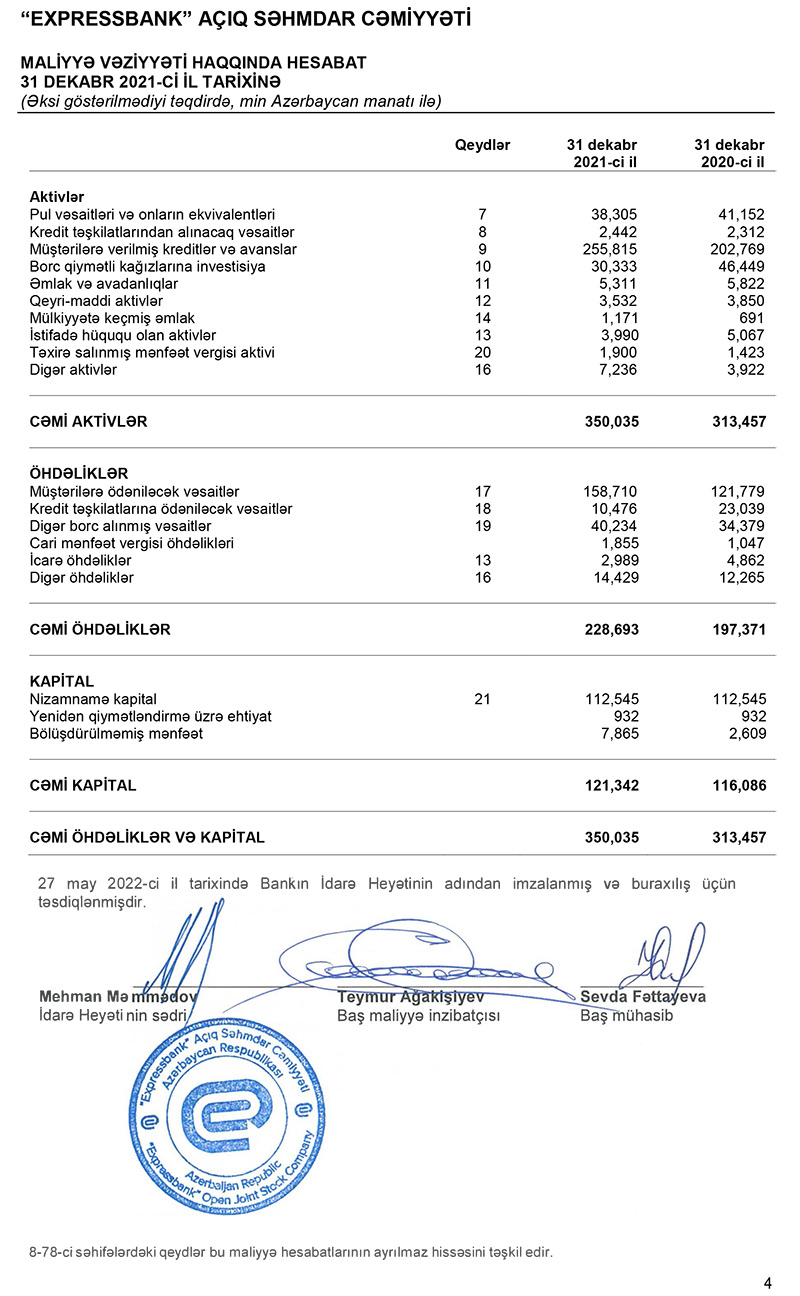 “Expressbank” 2021-ci il üzrə audit hesabatını açıqladı