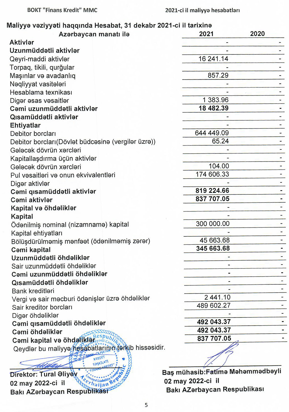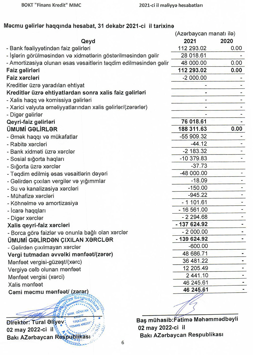 2020-ci ilin Oktyabr ayında lisenziya almış və 2021-ci ildən faktiki fəaliyyətə başlamış Bank Olmayan Kredit Təşkilatı “Finans Kredit” MMC 2021-ci il üzrə maliyyə göstəricilərini açıqlayıb.