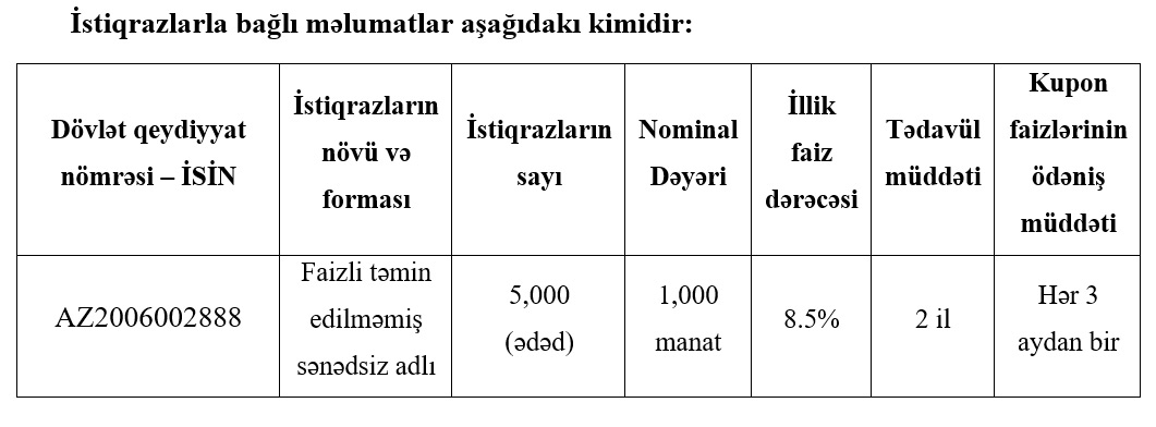 Birja-dan Marja-ya daxil olmuş məlumata görə, faizli təmin edilməmiş sənədsiz adlı istiqrazların sayı 5000 ədəd, hər birinin nominal dəyir 1000 manat, illik faiz dərəcəsi 8,5%, tədavül müddəti 2 il, kupon faizlərinin ödəniş müddəti Hər 3 aydan birdir.