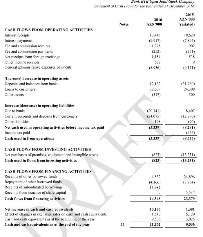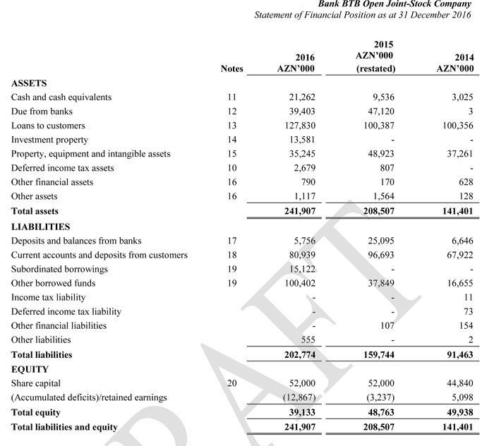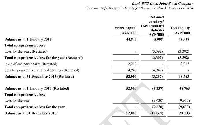 Hesabata görə, Bank BTB-nin 2015-ci ildə 3 milyon 392 min manat, 2016-cı ildə isə 9 milyon 630 min manat xalis zərəri olub. Son iki ildəki zərər 13 milyon manatı ötüb.