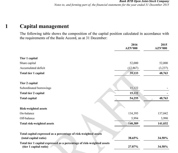 Hesabatdan məlum olur ki, 2015-ci ilin sonunda Bank BTB-nin məcmu kapitalı 48 milyon 763 min manata düşübmüş.