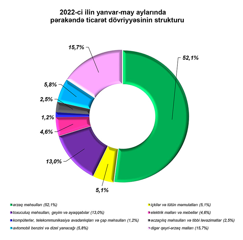 2022-ci ilin yanvar-may aylarında alıcıların son istehlak məqsədilə aldıqları mallara xərclədiyi vəsaitin 52,1 faizi ərzaq məhsullarının, 5,1 faizi içkilər və tütün məmulatlarının, 13,0 faizi toxuculuq məhsulları, geyim və ayaqqabıların, 5,8 faizi avtomobil benzini və dizel yanacağının, 4,6 faizi elektrik malları və mebellərin, 2,5 faizi əczaçılıq məhsulları və tibbi ləvazimatların, 1,2 faizi kompüterlər, telekommunikasiya avadanlıqları və çap məhsullarının, 15,7 faizi isə digər qeyri-ərzaq mallarının alınmasına sərf olunmuşdur.