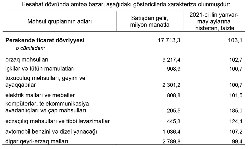 Dövlət Statistika Komitəsinin yaydığı məlumata görə, 2021-ci ilin yanvar-may ayları ilə müqayisədə pərakəndə ticarət dövriyyəsi real ifadədə 3,1 faiz, o cümlədən ərzaq məhsulları, içkilər və tütün məmulatları üzrə 2,5 faiz, qeyri-ərzaq malları üzrə 3,8 faiz artmışdır. Hesabat dövründə əmtəə bazarı aşağıdakı göstəricilərlə xarakterizə olunmuşdur: