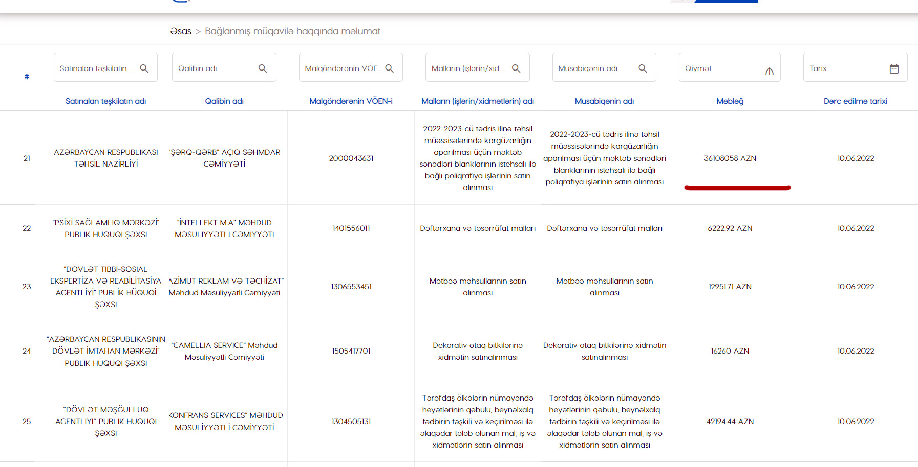 Portalda qeyd edilən məbləğə görə, Təhsil Nazirliyi "Şərq-Qərb" ASC ilə məbləği 36 milyon 108 min 58 manat olan müqavilə imzalayıb.