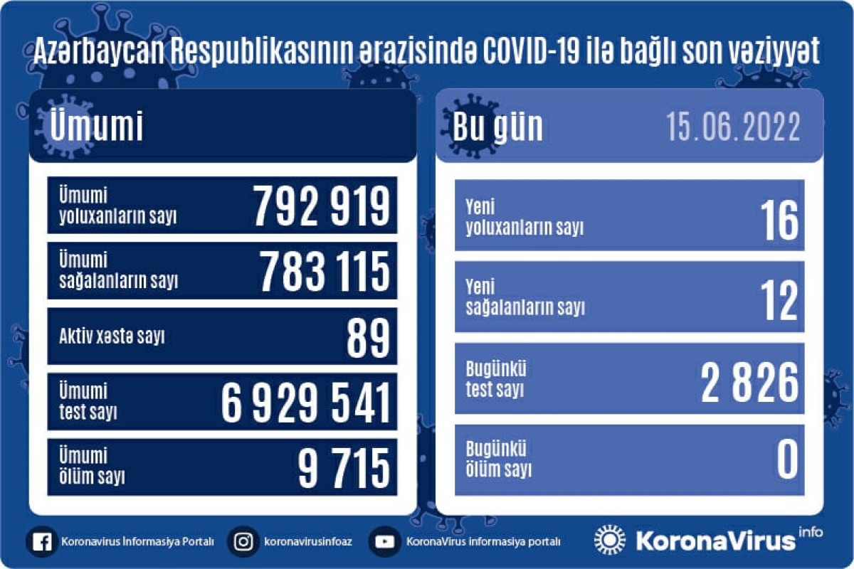 Azərbaycanda koronavirus (COVID-19) infeksiyasına 16 yeni yoluxma faktı qeydə alınıb, 12 nəfər müalicə olunaraq sağalıb.