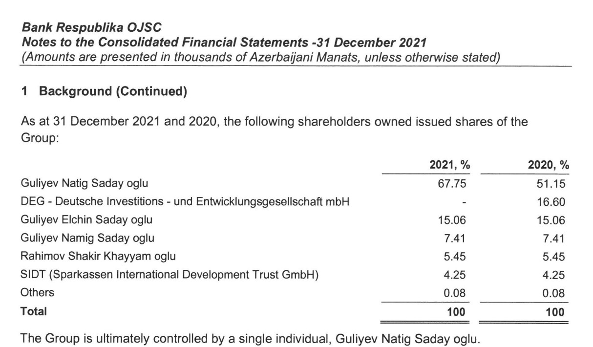 "Bank Respublika" ötən ilin sonunda beşillik strategiyasının uğurlu nəticələrinə həsr olunmuş məlumatında qeyd etmişdi ki, 2021-ci ildə Bankın yaxşı maliyyə göstəricilərini, inkişaf perspektivlərini və növbəti illərdə dividendlərin ödənilməsini nəzərə alaraq, bankın strateji səhmdarı olan Natiq Quliyev DEG-in "Bank Respublika"nın kapitalındakı payını tam olaraq almışdır.