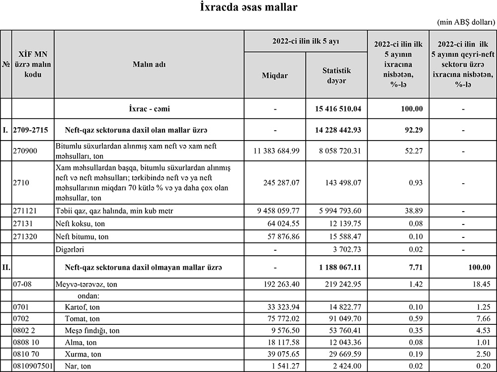 2021-ci ilin ilk 5 ayı ərzində Azərbaycandan 6 milyard 519 milyon 732 min dollarlıq neft-qaz sektoruna daxil olan mallar, o cümlədən 4 milyard 927 milyon 241 min dollarlıq xam neft, 1 milyard 335 milyon 749 min dollarlıq təbii qaz ixrac edilmişdi.