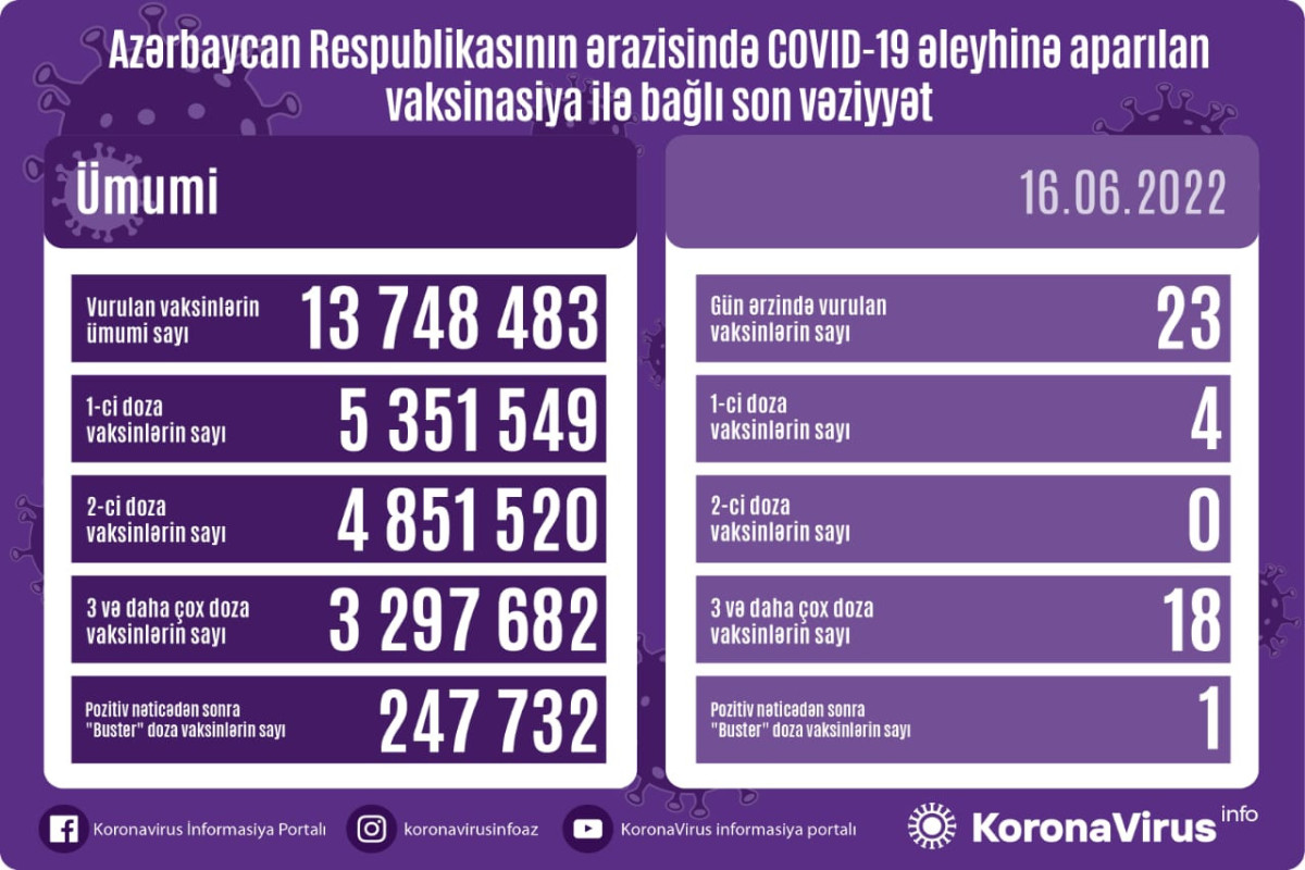 Azərbaycanda son sutkada koronavirus (COVID-19) əleyhinə 23 vaksin vurulub. Bir gündə birinci mərhələ üzrə vaksinasiya olunanların sayı 4, ikinci mərhələ üzrə vaksinasiya olunanların sayı 0, üç və daha çox doza vaksin vurduranların sayı 18, pozitiv nəticədən sonra buster doza üzrə vaksinasiya olunanların sayı isə 1 nəfərdir.