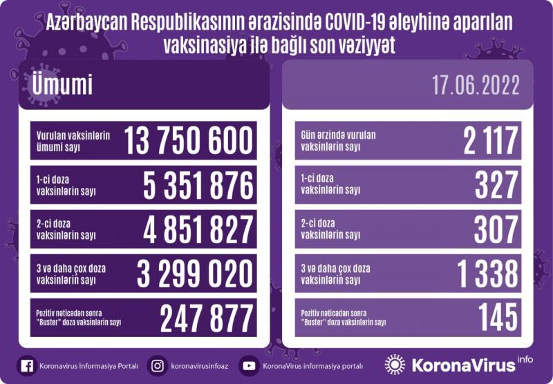 Azərbaycanda son sutkada koronavirus (COVID-19) əleyhinə 2117 vaksin vurulub. Bir gündə birinci mərhələ üzrə vaksinasiya olunanların sayı 327, ikinci mərhələ üzrə vaksinasiya olunanların sayı 307, üç və daha çox doza üzrə vaksinasiya olunanların sayı 1338, pozitiv nəticədən sonra buster doza üzrə vaksinasiya olunanların sayı 145 nəfərdir.