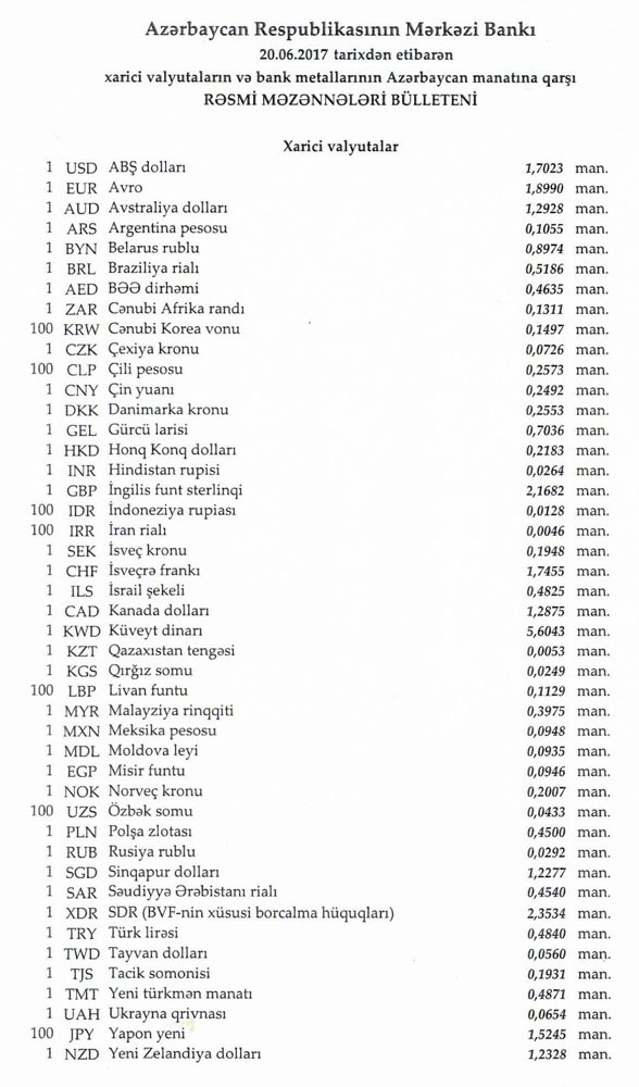 İyunun 20-nə Mərkəzi Bankın açıqladığı rəsmi Dollar/manat məzənnəsi İyunun 19-u ilə müqayisədə dəyişməyərək 1,7023 manat olub, Avro/manat məzənnəsi 1.8990 manata düşüb.