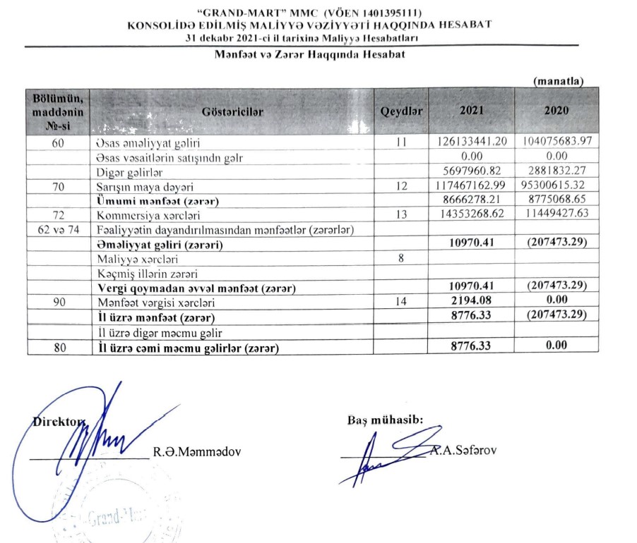 "Grandmart" supermarketlər şəbəkəsi ötən il 132 milyon manata yaxın satış və digər gəlirlərinə qarşı 8 min 776 manat xalis mənfəət əldə edib."Grandmart" supermarketlər şəbəkəsini idarə edən "Grand - Mart" MMC 2021-ci ili 8 min 776 manat xalis mənfəət ilə başa vurub. Halbuki, şirkət 2020-ci ili 207 min 473 manat xalis zərər ilə bağlamışdı.
