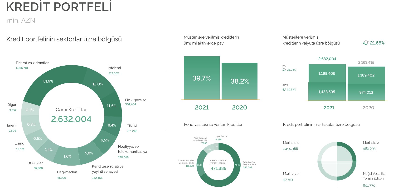 Marja-nın məlumatına görə, 2021-ci ilin yekunlarına həsr olunmuş mətbuat konfransında "PAŞA Bank"ın İdarə Heyətinin üzvü, Baş maliyyə inzibatçısı Bəhruz Nağıyev bildirib ki, 2021-ci ilin sonunda "PAŞA Bank" tərəfindən müştərilərə verilmiş cəmi kreditlər 2 milyard 632 milyon 4 min manat təşkil edib. Cəmi kreditlərin 1 milyard 366 milyon 781 min manatı və ya 51,9%-i ticarət və xidmət sektoruna, 317 milyon 62 min manatı və ya 12%-i istehsal sektoruna, 301 milyon 404 min manatı və ya 11,5%-i fiziki şəxslərə, 221 milyon 248 min manatı və ya 8,4%-i tikinti sektoruna, 170 milyon 18 min manatı və ya 6,5%-i nəqliyyat və telekomunikasiyaya, 152 milyon 466 min manatı və ya 5,8%-i kənd təsərrüfatı və yeyinti sənayesinə, 41 milyon 706 min manatı və ya 1,6%-i dağ-mədən sahəsinə, 37 milyon 388 min manatı və ya 1,4%-i BOKT-lara, 12 milyon 571 min manatı və ya 0,5%-i lizinq üzrə, 7 milyon 503 min manatı və ya 0,3%-i enerji səhsəinə, 3 milyon 557 min manatı və ya 0,1%-i digər sahələrə ayrılıb.