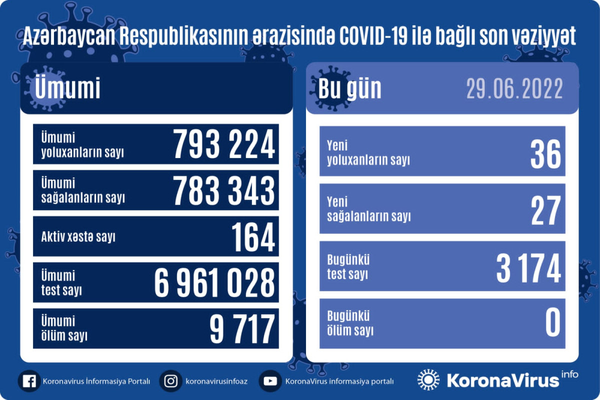 Azərbaycanda koronavirus (COVID-19) infeksiyasına 36 yeni yoluxma faktı qeydə alınıb, 27 nəfər müalicə olunaraq sağalıb.