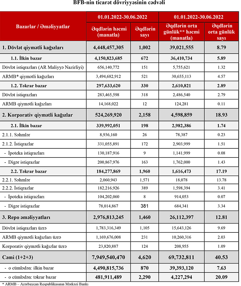 Bakı Fond Birjasında 01.01.2022-30.06.2022 tarixləri ərzində qiymətli kağızlar üzrə keçirilən əməliyyatların ümumi həcmi 7 milyard 949 milyon 540 min manat təşkil etmişdir. Ötən ilin eyni dövründə Birjada qiymətli kağızlar üzrə keçirilən əməliyyatların ümumi həcmi 8 milyard 303 milyon 60 min manat təşkil etmişdi. Beləliklə, ticarətin həcmində azalma baş verib.