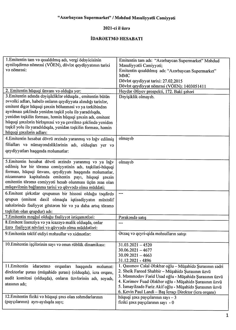 31 Dekabr 2021-ci il tarixində “Azərbaycan Supermarket” şirkəti 4896 nəfər işçiyə malik olub. Şirkət 2021-ci ilin 1-ci rübünün sonunda 4520 nəfər işçiyə malik idi. Ötən ilin 9 ayı ərzində “Azərbaycan Supermarket”in işçilərinin sayı 376 nəfər artıb.
